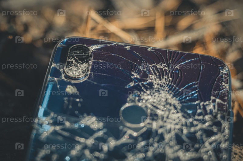 Сломанный новый смартфон со стеклянным корпусом. Треснутое стекло. Крупный план, пространство для копирования, горизонтальная композиция