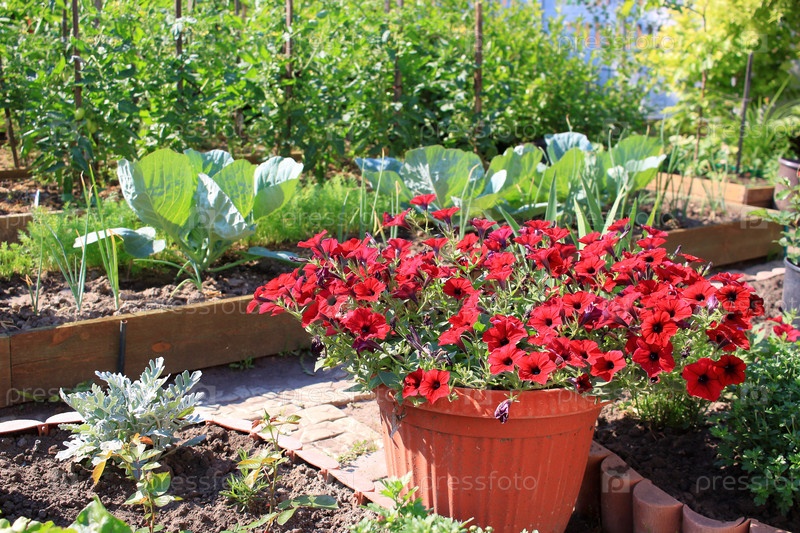 Цветы питунии в горшках в саду Сибири