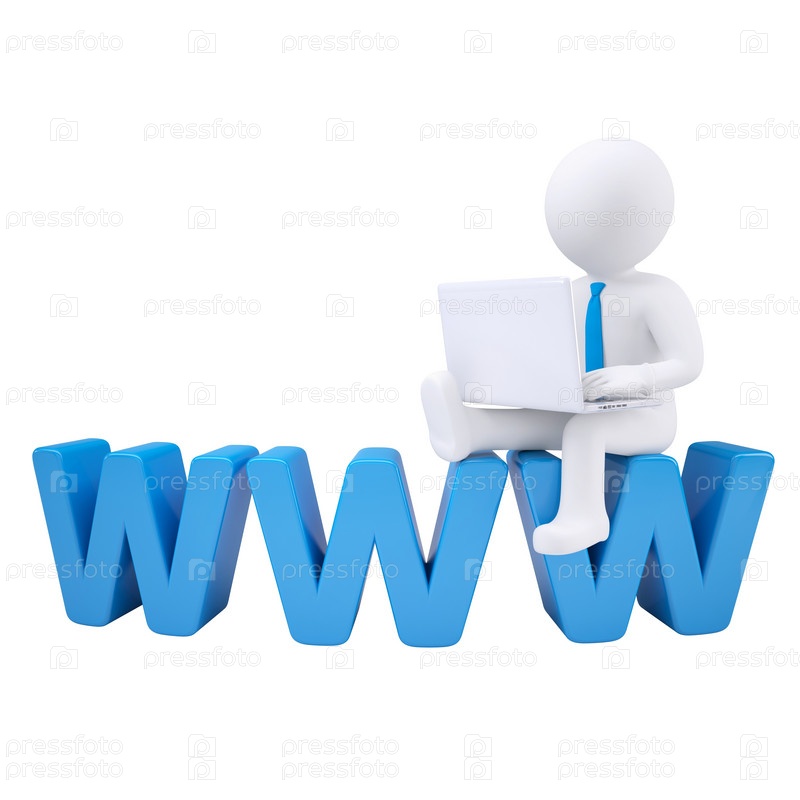 3D белый человек сидит на буквах 'WWW'