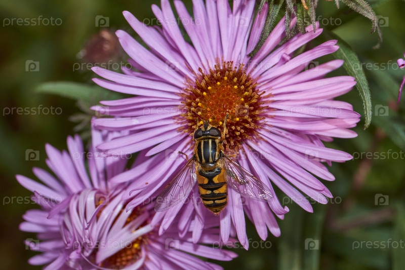 Муха собирает нектар и пыльцу с цветков многолетней астры. Осень