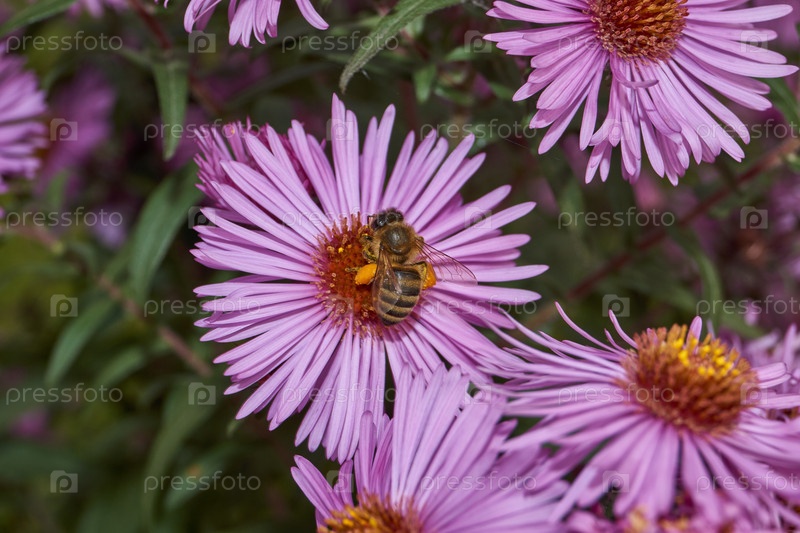 Пчела (лат. anthophila) собирает нектар и пыльцу из цветов многолетней астры