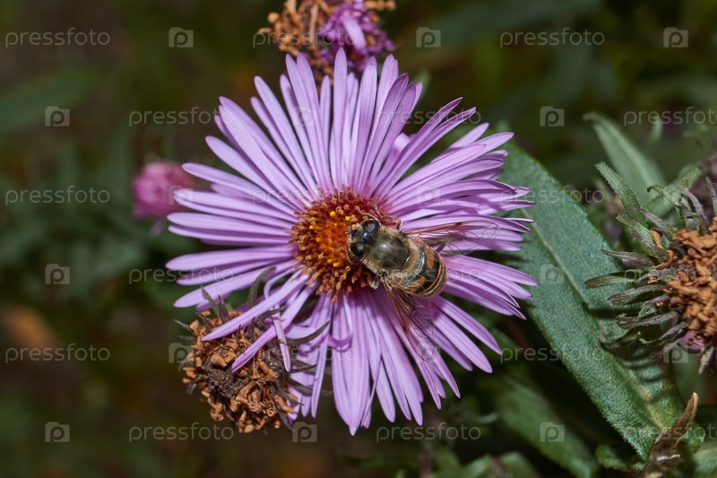 Муха собирает нектар и пыльцу с цветков многолетней астры. Осень