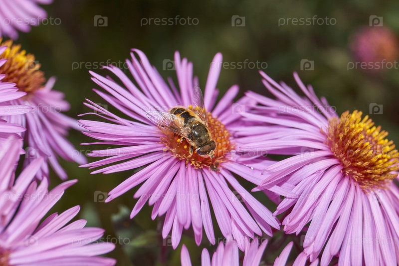 Муха собирает нектар и пыльцу с цветков многолетней астры. Осень