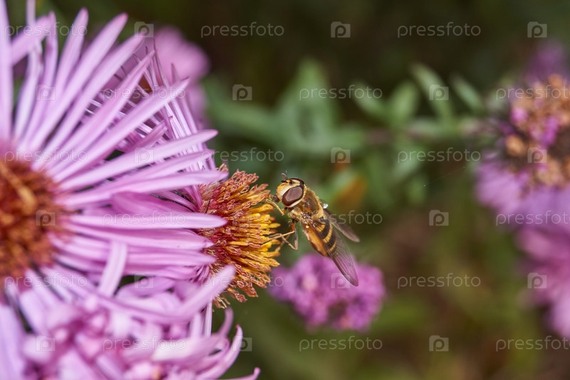 Муха собирает нектар и пыльцу с цветков многолетней астры. Осень