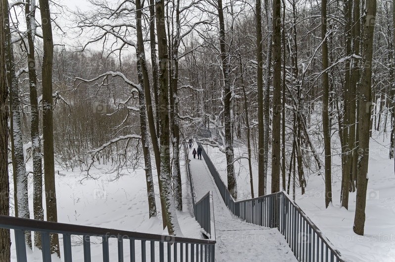 Пешеходный мостик через небольшой овраг. Верховья реки Чертановка. Битцевский лесопарк, Москва. Пасмурный день в январе