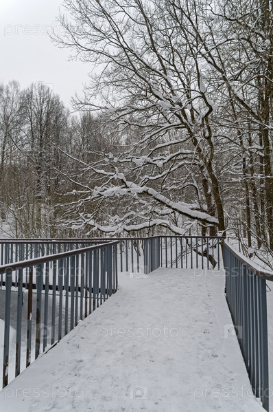 Пешеходный мостик через небольшой овраг. Верховья реки Чертановка. Битцевский лесопарк, Москва. Пасмурный день в январе