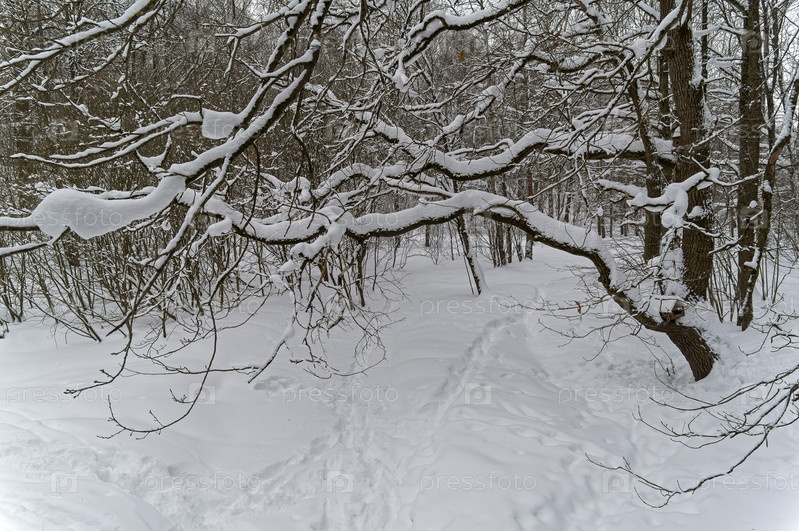 Зимний лес. Заснеженные ветки деревьев. Верховья реки Чертановка. Узкое, Битцевский лесопарк, Москва