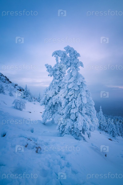 Наклонившаяся под тяжестью снега ель на вершине горы холодным зимним утром