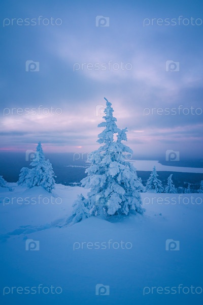 Красивый зимний пейзаж в горах. Деревья и скала покрытые снегом на вершине горного хребта на рассвете