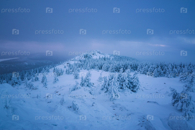 Красивый зимний пейзаж в горах. Деревья и скала покрытые снегом на вершине горного хребта на рассвете