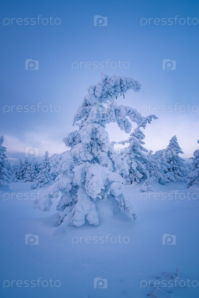 Наклонившаяся под тяжестью снега ель на вершине горы холодным зимним утром