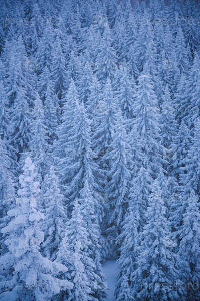 Покрытые снегом ели с вершины горы на рассвете. Сказочный зимний пейзаж