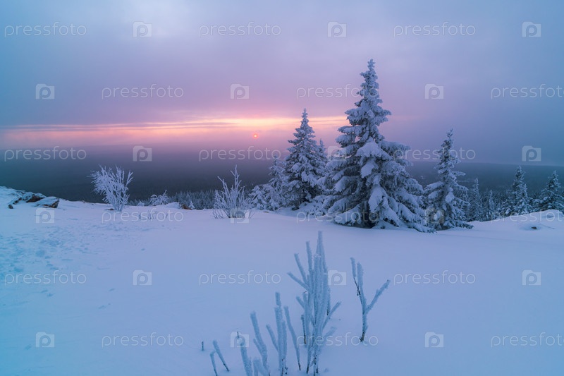 Зимний пейзаж с покрытыми снегом деревьями. Красочный морозный рассвет на вершине горы в Национальном парке Зюраткуль