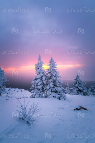 Зимний пейзаж с покрытыми снегом деревьями. Красочный морозный рассвет на вершине горы в Национальном парке Зюраткуль