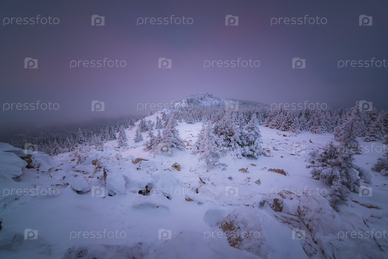 Красивый зимний пейзаж в горах. Деревья и скала покрытые снегом на вершине горного хребта на рассвете