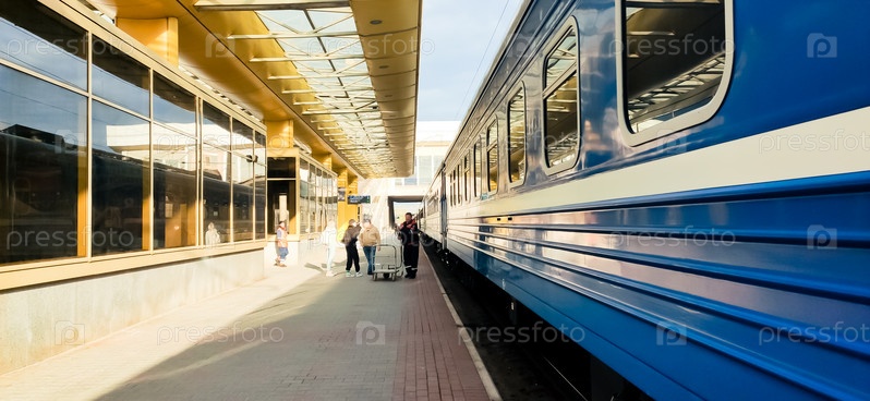 Вагон синего цвета на платформе железнодорожного вокзала