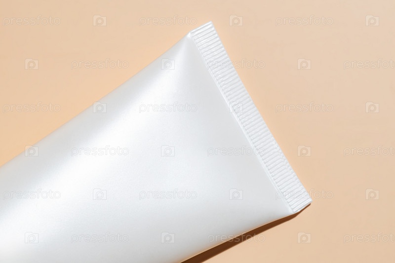 Мокет белой пластиковой трубы для сжатия бутылки для брендинга лекарств или косметики - крема, геля, ухода за кожей, зубной пасты. контейнер для косметической бутылки на бежевом фоне. минимализм