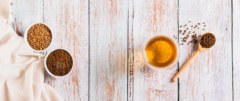 Стакан полезного гречневого чая и гранулы для заваривания в миске, вид сверху, веб-баннер