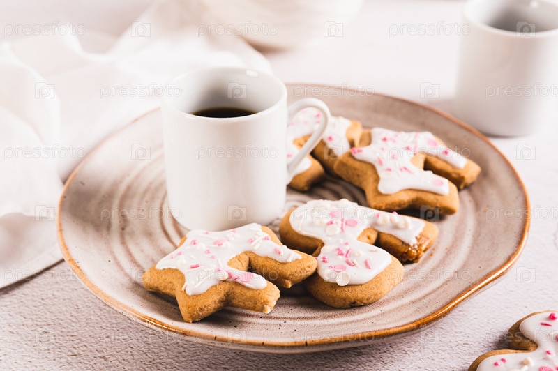 Сладкое печенье, обнимающее кружку, и чашка кофе на тарелке