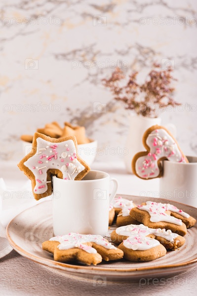 Домашнее печенье, обнимающее кофейную кружку на тарелке на столе, вертикальный вид