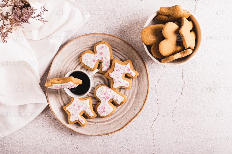 Домашнее печенье, обнимающее кофейную кружку на тарелке на столе, вид сверху