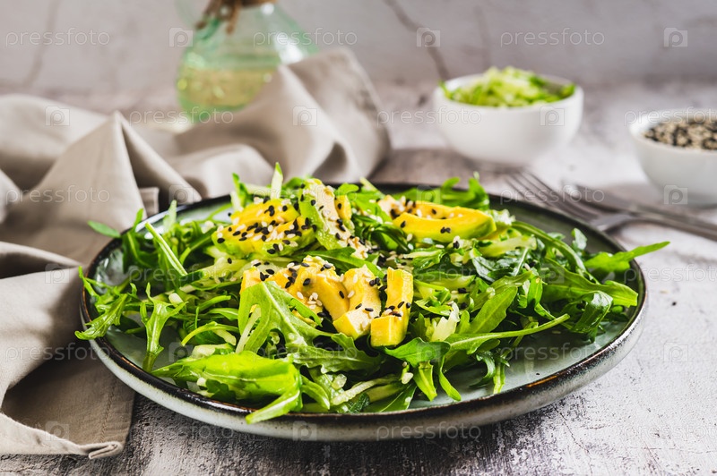 Вегетарианский салат из листьев рукколы, огурца, авокадо и кунжута на тарелке
