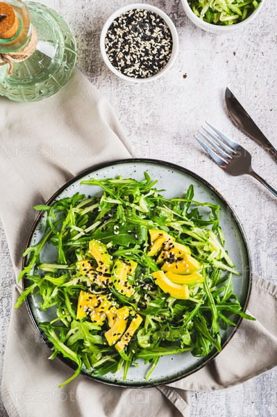 Диетический фитнес-салат из огурца, авокадо и рукколы на тарелке и вертикальном виде