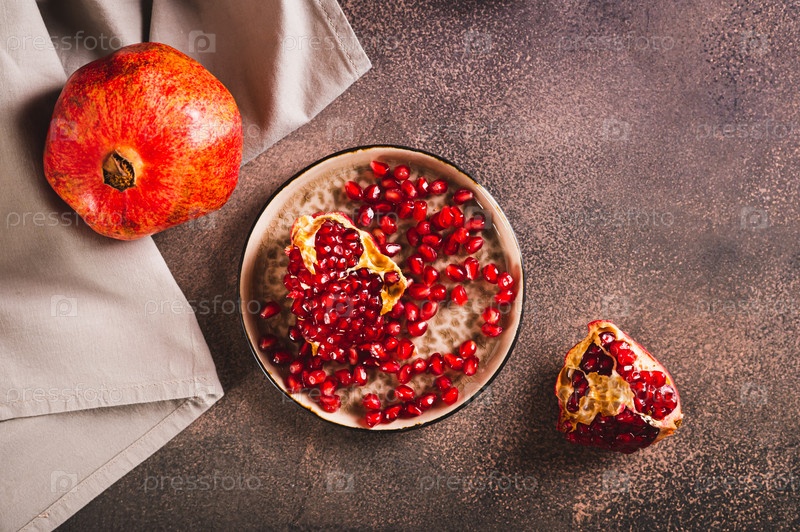 Кусочки и семена спелого свежего граната на тарелке на столе, вид сверху