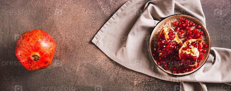 Свежий вкусный гранат, разделенный на кусочки на тарелке на столе, вид веб-баннера