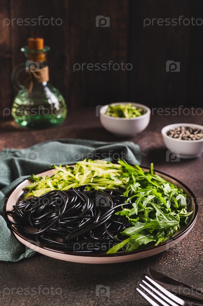 Вегетарианское блюдо черные спагетти, огурцы и листья рукколы на тарелке на столе, вертикальный вид