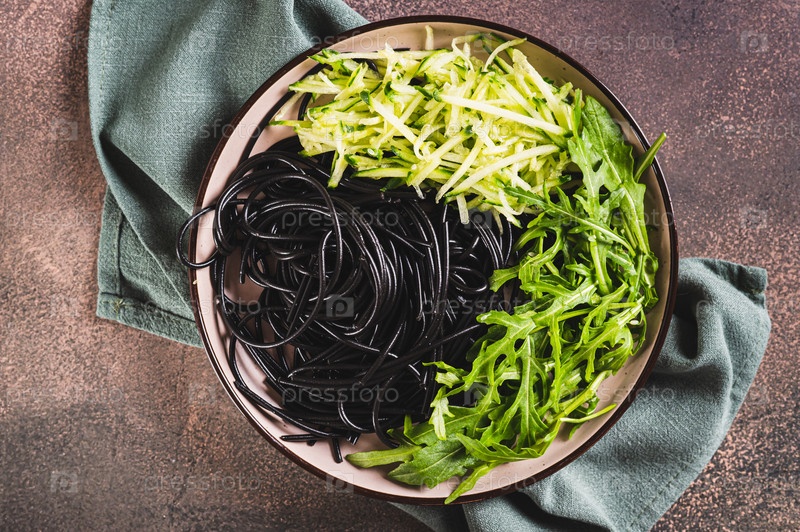 Крупный план вегетарианского блюда: черные спагетти, огурцы и листья рукколы на тарелке, вид сверху