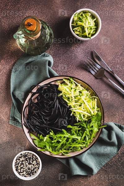 Лапша с чернилами каракатицы, огурцом и рукколой на тарелке на столе и вертикальный вид