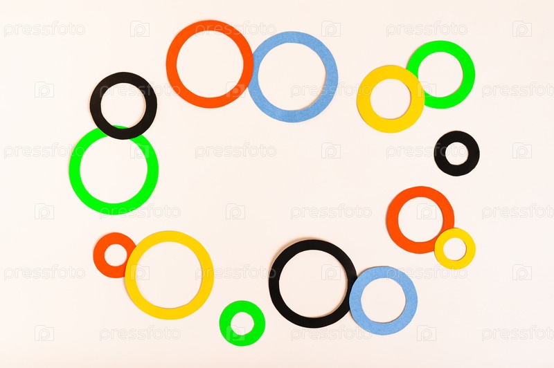 Олимпийские игры, Париж, Франция, лето 2024 года. Разноцветные кольца на светлом фоне