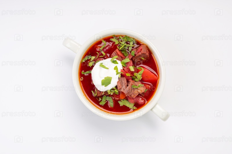 Бизнес ланч. Традиционный борщ с говядиной и сметаной в белой миске на белом фоне