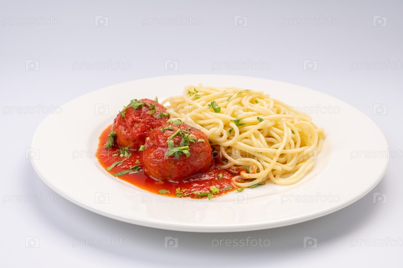 Бизнес ланч. Мясные шарики в томатном соусе со спагетти на белом фоне