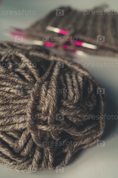 Вязание на спицах из овечьей пряжи. Селективный фокус