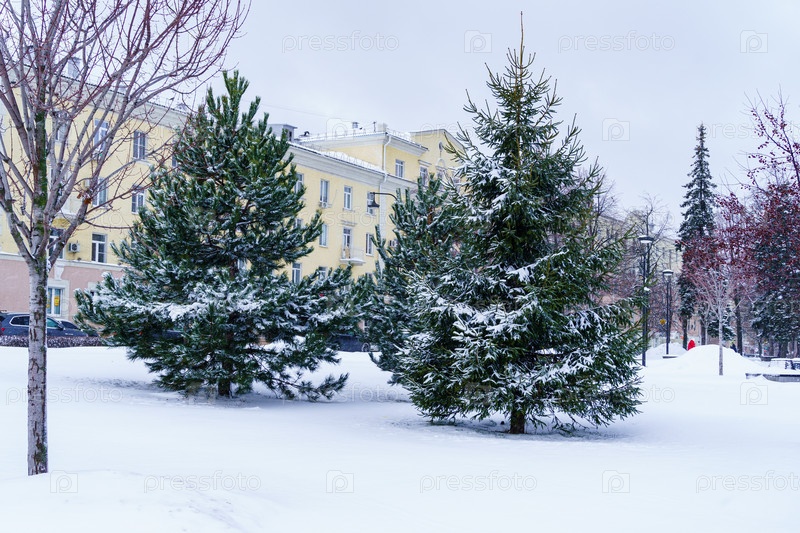 Сосна и ель в снегу на Советской площади. Воронеж