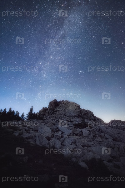 Красивое звездное небо и Млечный Путь над скалами на вершине горного хребта
