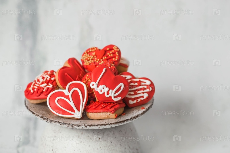 Домашнее имбирное печенье в форме сердца в красной сахарной пудре. Вкусное сердце имбирного печенья на светлом бетонном фоне. Свежеиспеченные пряники ко Дню святого Валентина