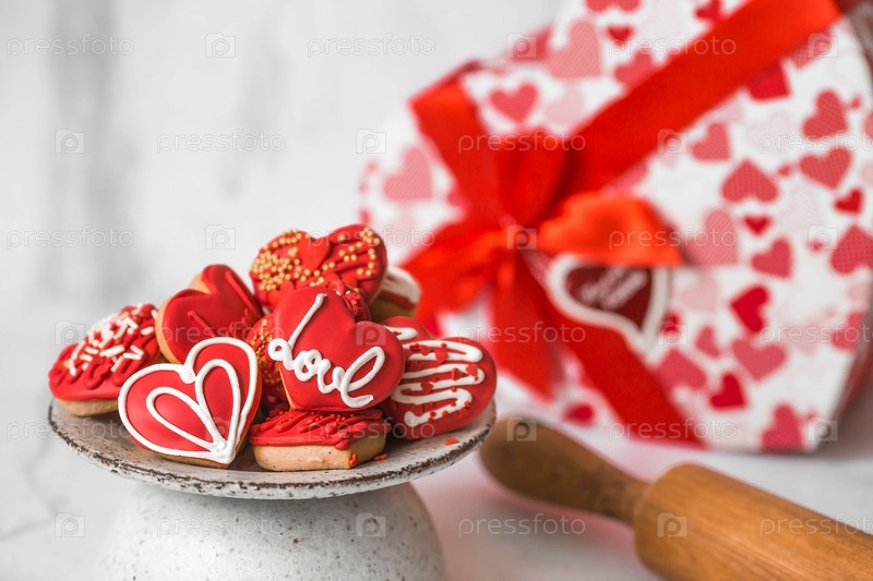 Домашнее имбирное печенье в форме сердца в красной сахарной пудре. Вкусное сердце имбирного печенья на светлом бетонном фоне. Свежеиспеченные пряники ко Дню святого Валентина