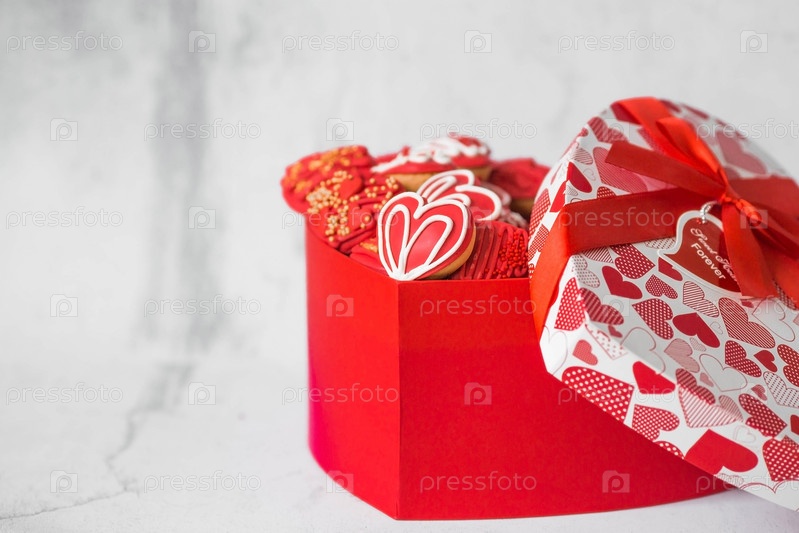 Домашнее имбирное печенье в форме сердца в красной сахарной пудре. Вкусное сердце имбирного печенья на светлом бетонном фоне. Свежеиспеченные пряники ко Дню святого Валентина