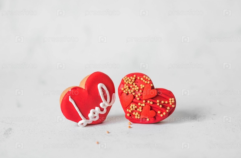 Домашнее имбирное печенье в форме сердца в красной сахарной пудре. Вкусное сердце имбирного печенья на светлом бетонном фоне. Свежеиспеченные пряники ко Дню святого Валентина