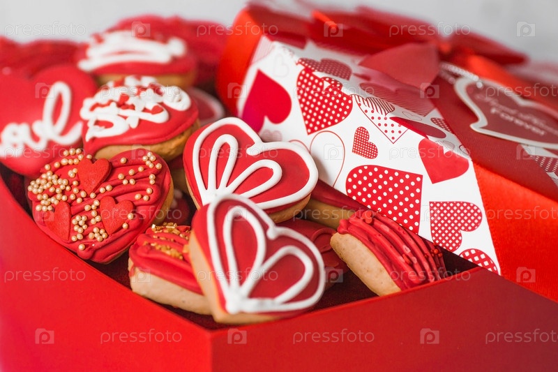 Домашнее имбирное печенье в форме сердца в красной сахарной пудре. Вкусное сердце имбирного печенья на светлом бетонном фоне. Свежеиспеченные пряники ко Дню святого Валентина
