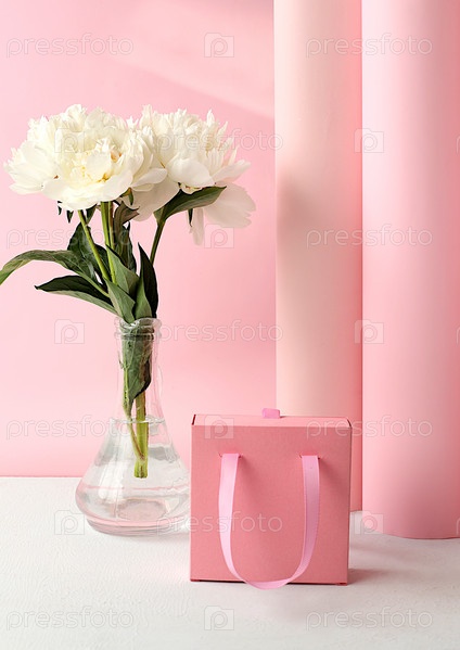 Абстрактная цветочная композиция, свежие цветы пиона и подарочная коробка. Открытка для поздравления с Днем матери, свадьбой, Женским днем. Минимальная современная эстетика. элегантная концепция красоты, избирательный фокус