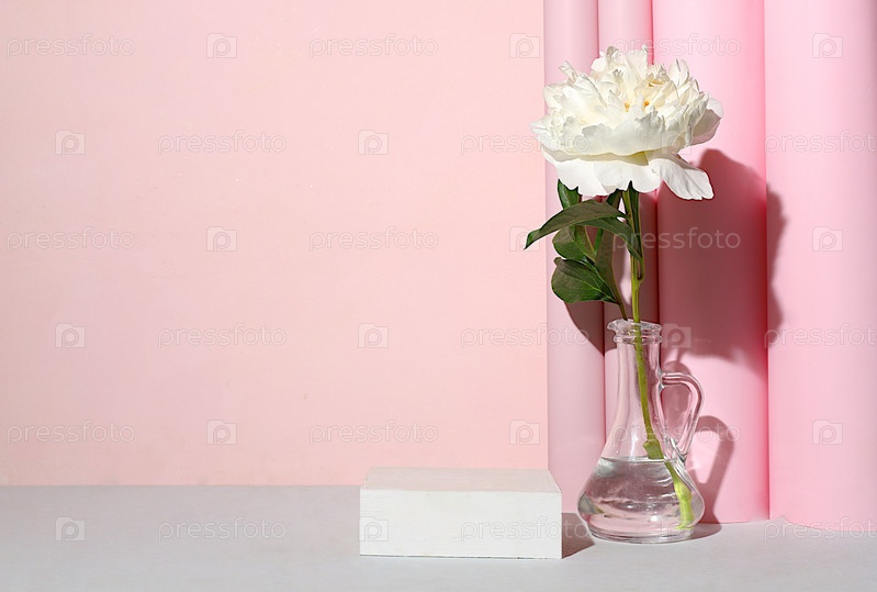 Этап для демонстрации продукта и бизнес-концепции. Минимальная современная эстетика. Абстрактная цветочная композиция, пустой подиум для продукции и свежие цветы пиона, элегантная концепция красоты,