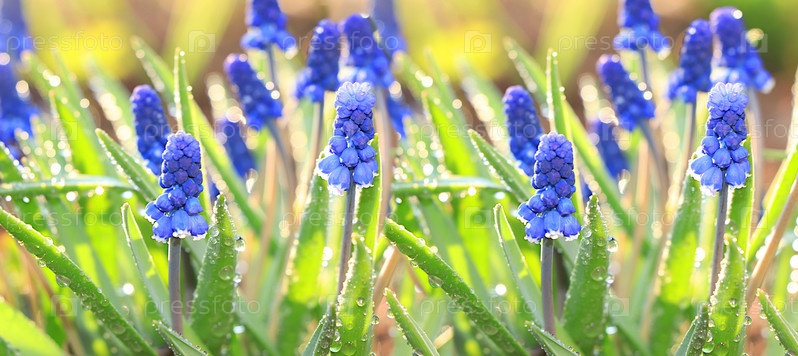 Абстрактное цветочное знамя, фон. Нежные цветы мускари в весеннем саду. Концепция весеннего прибытия, цветочная открытка, шаблон для дизайна, выборочный фокус