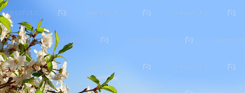 Абстрактное цветочное знамя. Нежные цветы вишни в весеннем саду на фоне голубого неба. Концепция весеннего прибытия, цветочная открытка, шаблон для дизайна