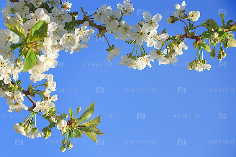 Абстрактное цветочное знамя. Нежные цветы вишни в весеннем саду на фоне голубого неба. Концепция весеннего прибытия, цветочная открытка, шаблон для дизайна ,