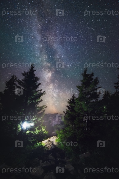 Млечный путь в звездном небе над лесом и деревьями