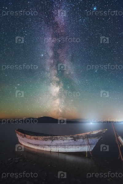 Красивое звездное небо и Млечный Путь над пришвартованной к берегу горного озера лодкой